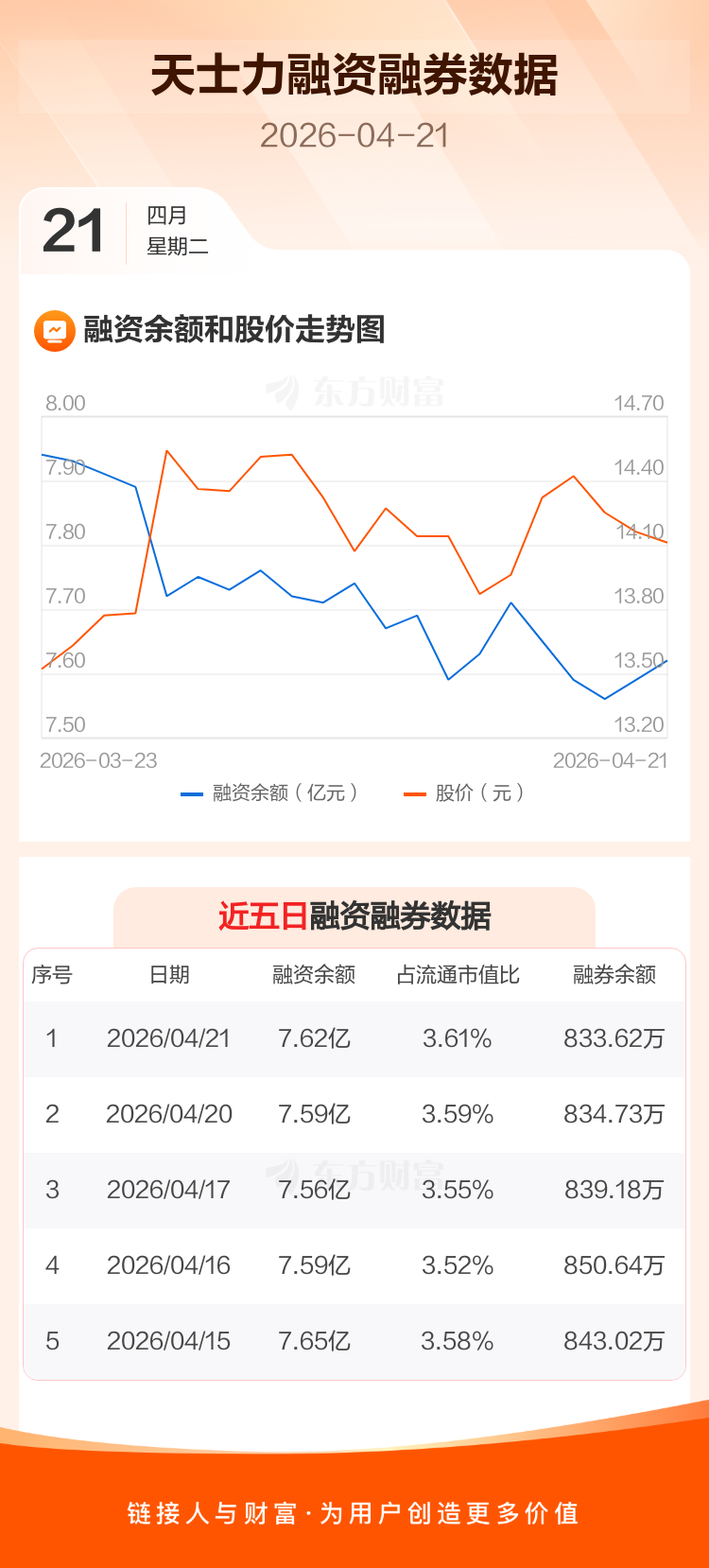 交易所最新数据显示,天士力于2026年4月21日获融资买入752.15万元,融资偿还427.16万元,当日融资净买入324.99万元。目前,该股融资余额7.62亿,占流通市值比例为3.61%。
