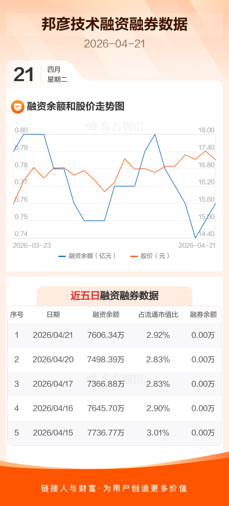 交易所最新数据显示,邦彦技术于2026年4月21日获融资买入192.70万元,融资偿还84.75万元,当日融资净买入107.95万元。目前,该股融资余额7606.34万,占流通市值比例为2.92%。