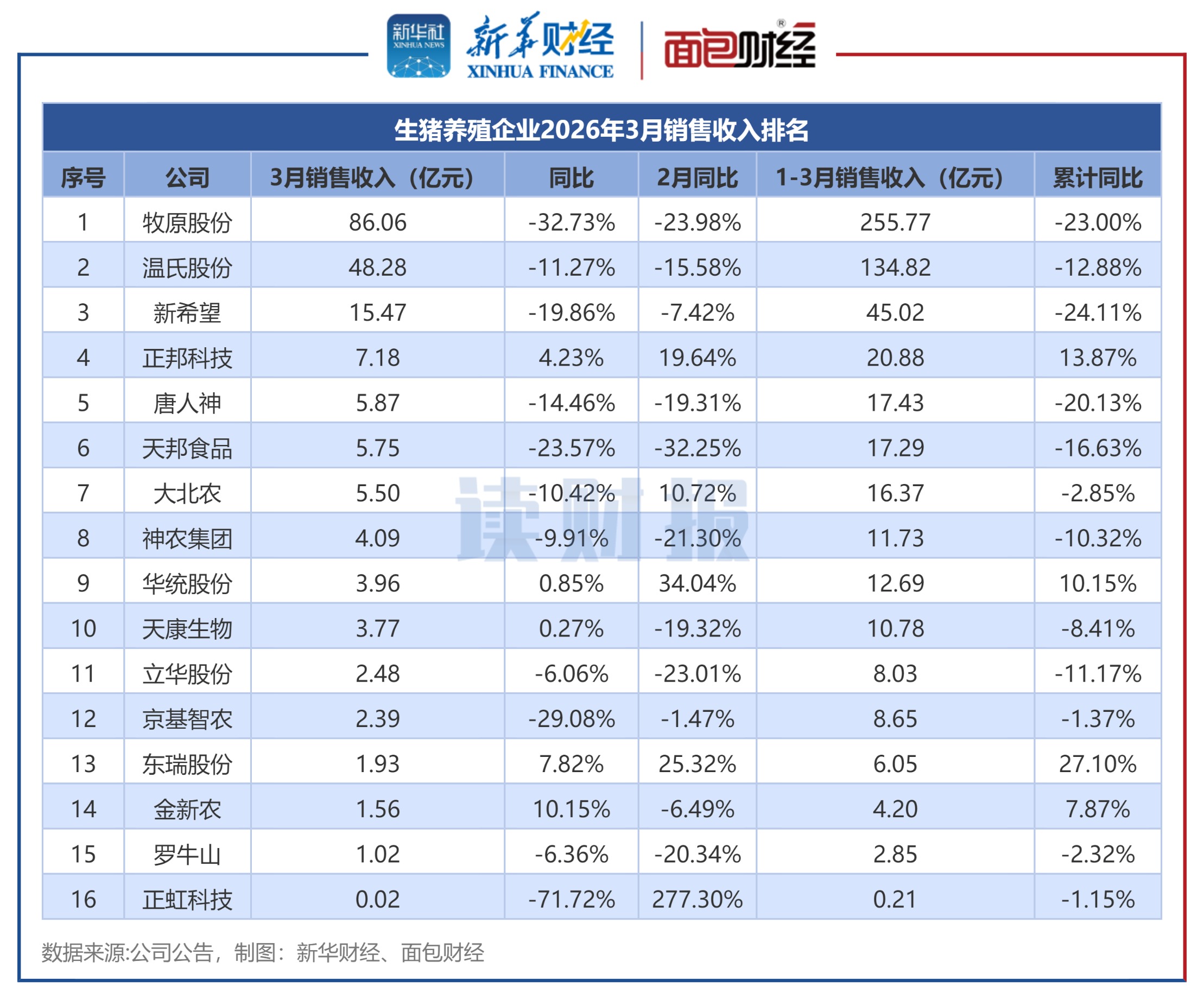 2026年3月,16家上市生猪养殖企业合计销售收入达195.34亿元(傲农生物未披露收入数据)。其中,牧原股份、温氏股份、新希望3月销售收入超过10亿元。