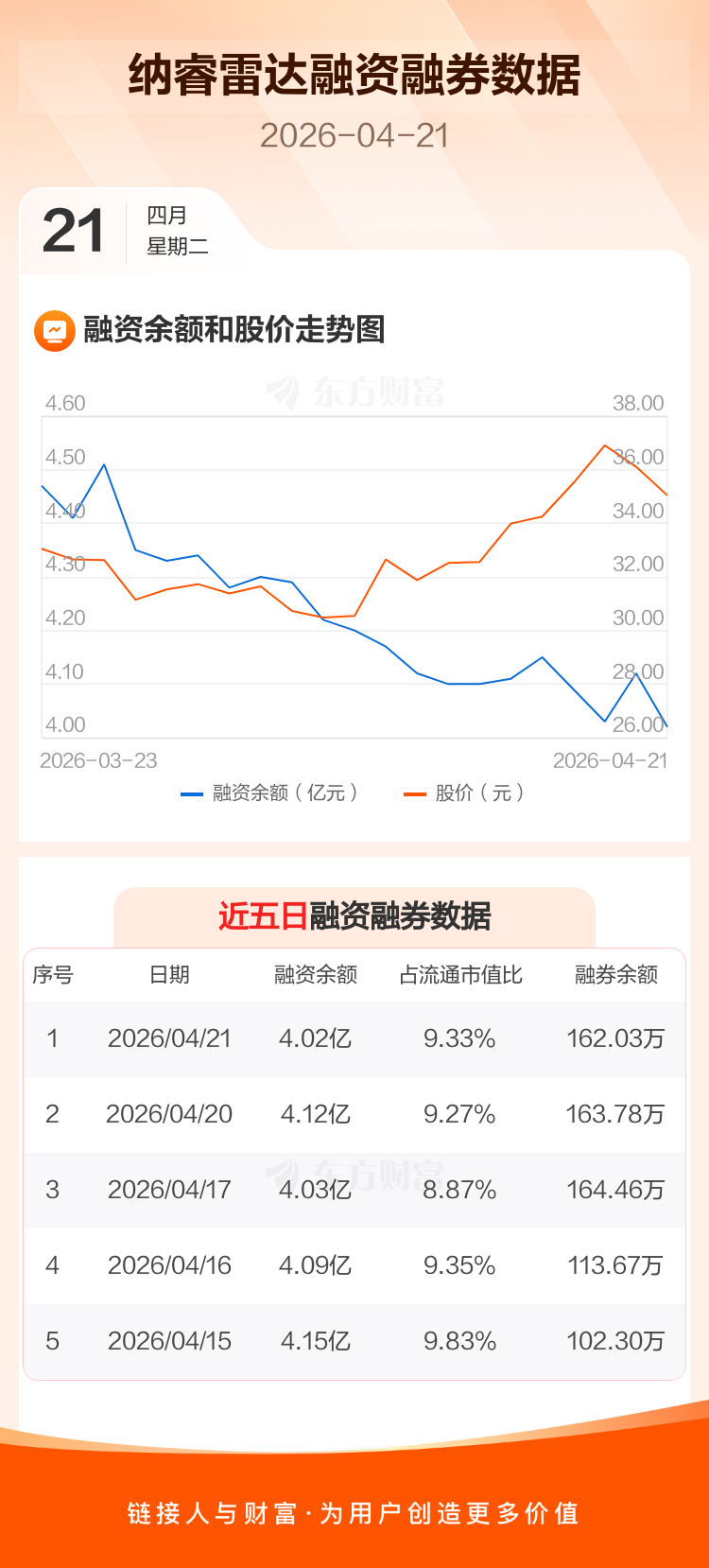 交易所最新数据显示,纳睿雷达于2026年4月21日获融资买入2118.40万元,融资偿还3095.12万元,当日融资净偿还976.72万元。目前,该股融资余额4.02亿,占流通市值比例为9.33%。