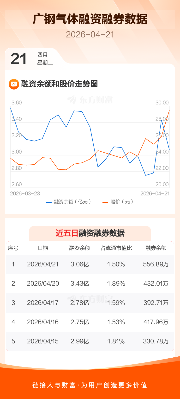 交易所最新数据显示,广钢气体于2026年4月21日获融资买入1.01亿元,融资偿还1.37亿元,当日融资净偿还3657.38万元。目前,该股融资余额3.06亿,占流通市值比例为1.50%。