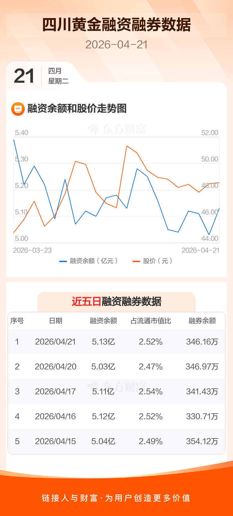 交易所最新数据显示,四川黄金于2026年4月21日获融资买入3001.09万元,融资偿还2015.47万元,当日融资净买入985.62万元。目前,该股融资余额5.13亿,占流通市值比例为2.52%。