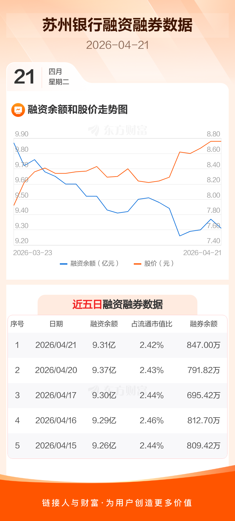 交易所最新数据显示,苏州银行于2026年4月21日获融资买入1203.99万元,融资偿还1817.65万元,当日融资净偿还613.66万元。目前,该股融资余额9.31亿,占流通市值比例为2.42%。