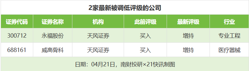 评级调低方面,4月21日,券商调低上市公司评级达到2家次,最新数据包括了天风证券对永福股份的评级从“买入”调低至“增持”,对威高骨科的评级从“买入”调低至“增持”。