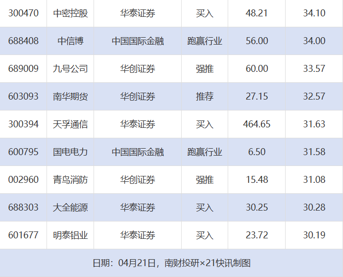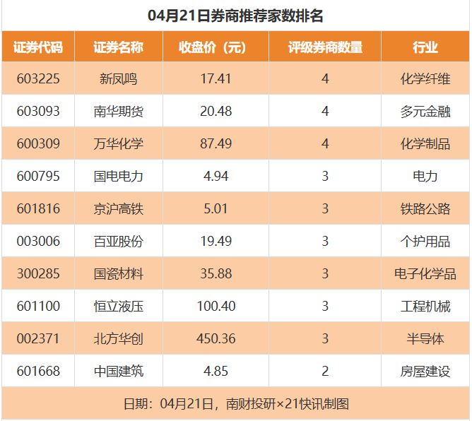 从券商推荐家数来看,4月21日有146家上市公司得到券商推荐,其中新凤鸣、南华期货、万华化学获得4家推荐。