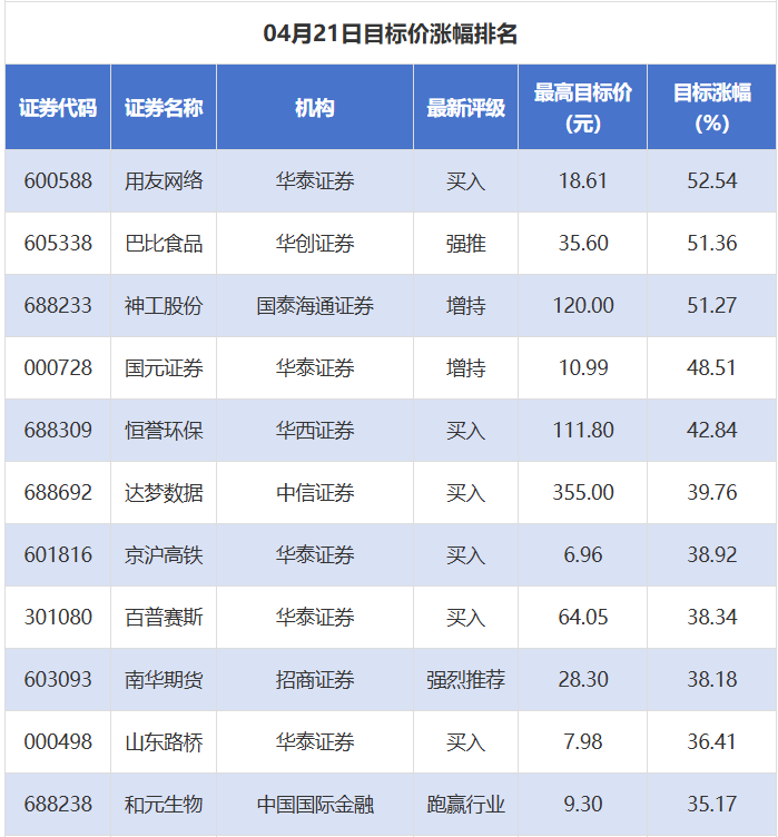 南财投研数据显示,4月21日,券商给予上市公司目标价共74次,按最新收盘价计算,目标价涨幅排名居前的公司有用友网络、巴比食品、神工股份,目标价涨幅分别为52.54%、51.36%、51.27%,分别属于软件开发、食品加工、半导体行业。