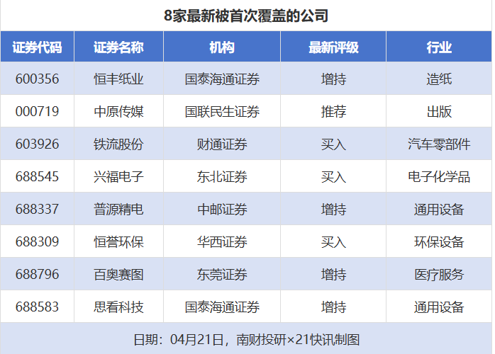 首次覆盖方面,4月21日券商共给出了8次首次覆盖,其中恒丰纸业获得国泰海通证券给予“增持”评级,中原传媒获得国联民生证券给予“推荐”评级,铁流股份获得财通证券给予“买入”评级,兴福电子获得东北证券给予“买入”评级,普源精电获得中邮证券给予“增持”评级。