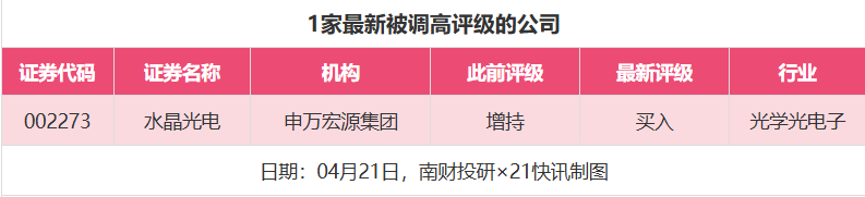 评级调高方面,4月21日,券商调高上市公司评级达到1家次,申万宏源集团对水晶光电的评级从“增持”调高至“买入”。