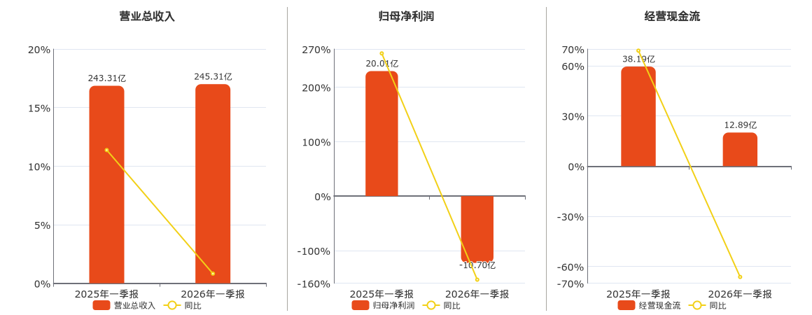 公司营业总收入为245.31亿元,较去年同报告期营业总收入增加7484.28万元,实现4年连续上涨,同比较去年同期上涨0.31%。归母净利润为-10.70亿元。经营活动现金净流入为12.89亿元。