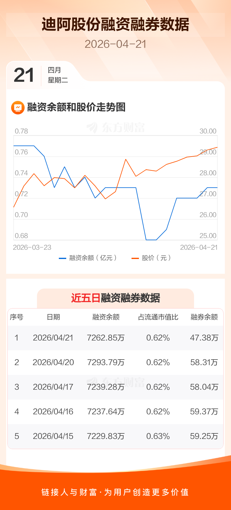 交易所最新数据显示,迪阿股份于2026年4月21日获融资买入108.27万元,融资偿还139.22万元,当日融资净偿还30.95万元。目前,该股融资余额7262.85万,占流通市值比例为0.62%。