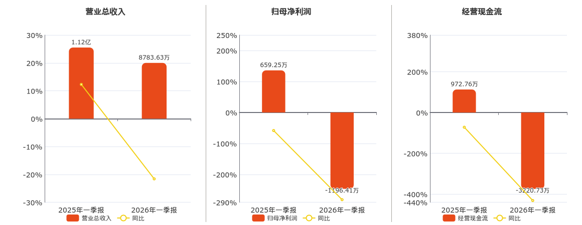 公司营业总收入为8783.63万元,较去年同报告期营业总收入减少2418.87万元,同比较去年同期下降21.59%。归母净利润为-1196.41万元,较去年同报告期归母净利润减少1855.66万元,同比较去年同期下降281.48%。经营活动现金净流入为-3220.73万元,较去年同报告期经营活动现金净流入减少4193.49万元,同比较去年同期下降431.09%。