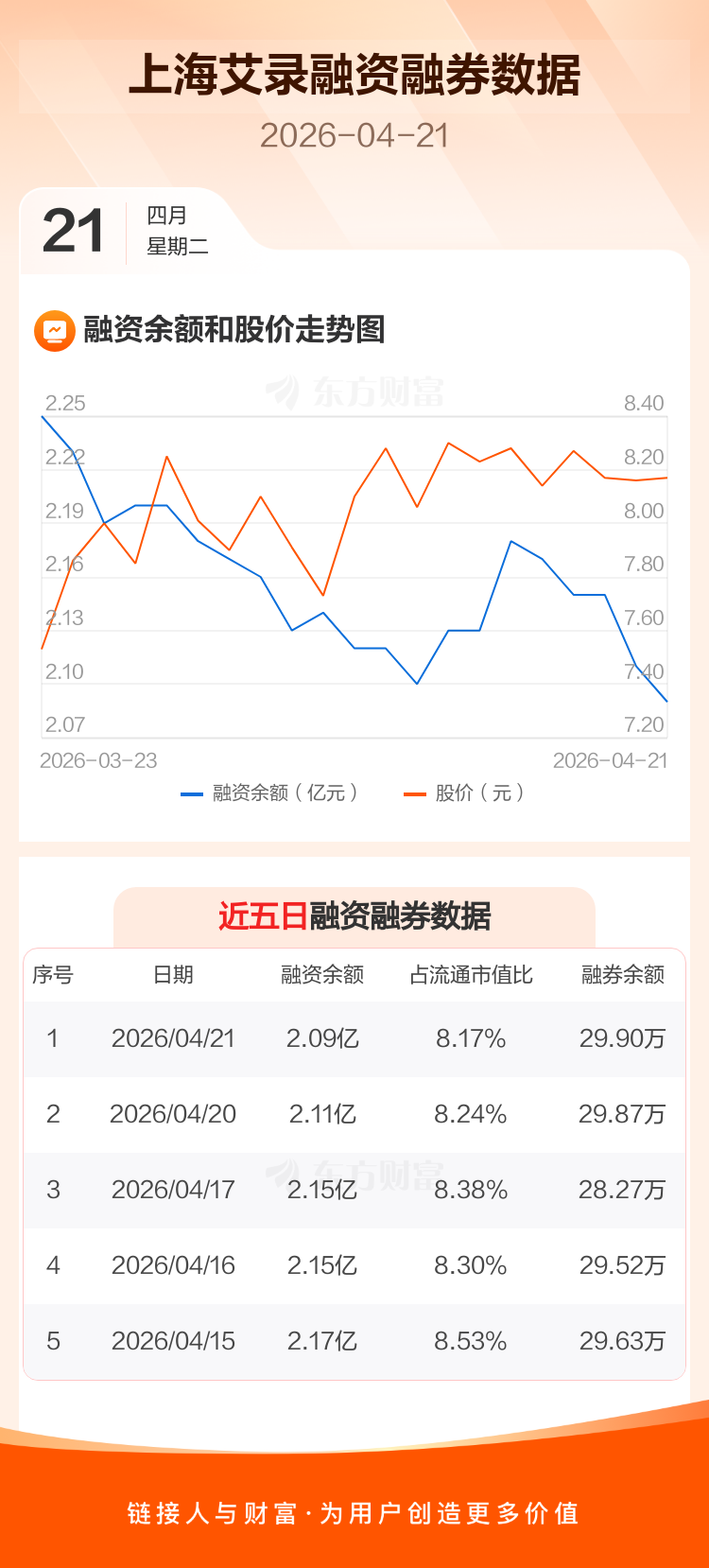 交易所最新数据显示,上海艾录于2026年4月21日获融资买入309.60万元,融资偿还445.72万元,当日融资净偿还136.11万元。目前,该股融资余额2.09亿,占流通市值比例为8.17%。