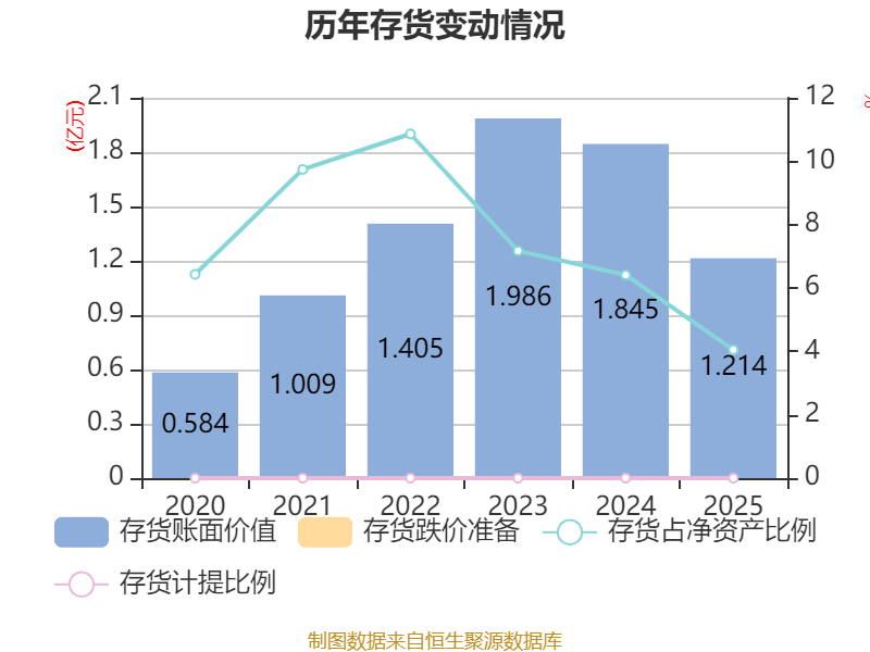 从存货变动来看,截至2025年末,公司存货账面价值为1.21亿元,占净资产的4.05%,较上年末减少6314.73万元。公司本期没有计提存货跌价准备。