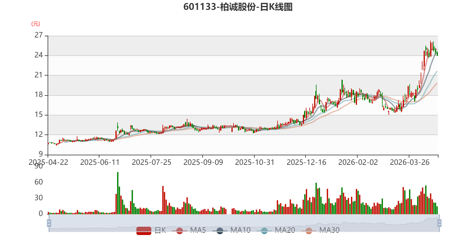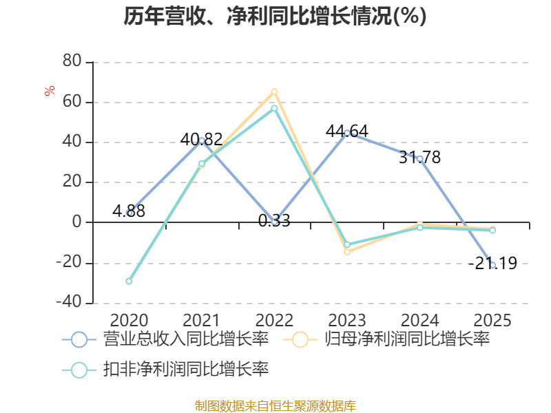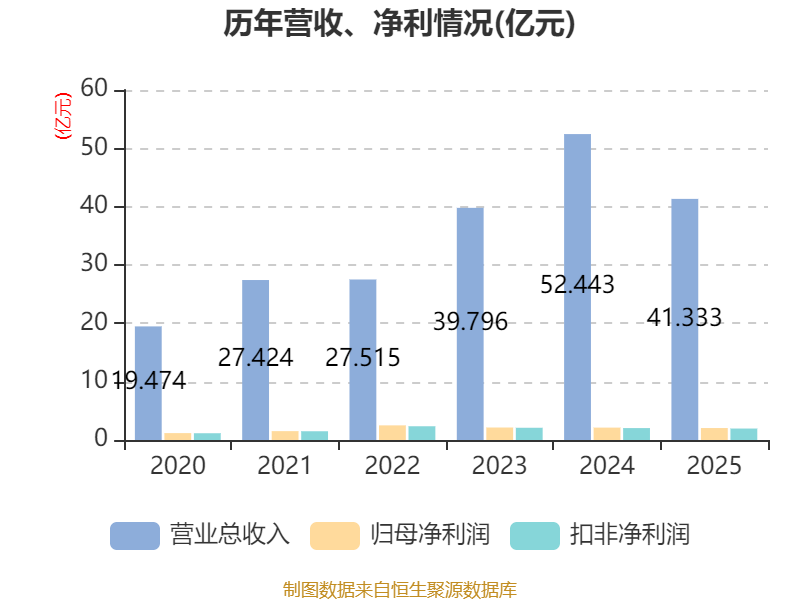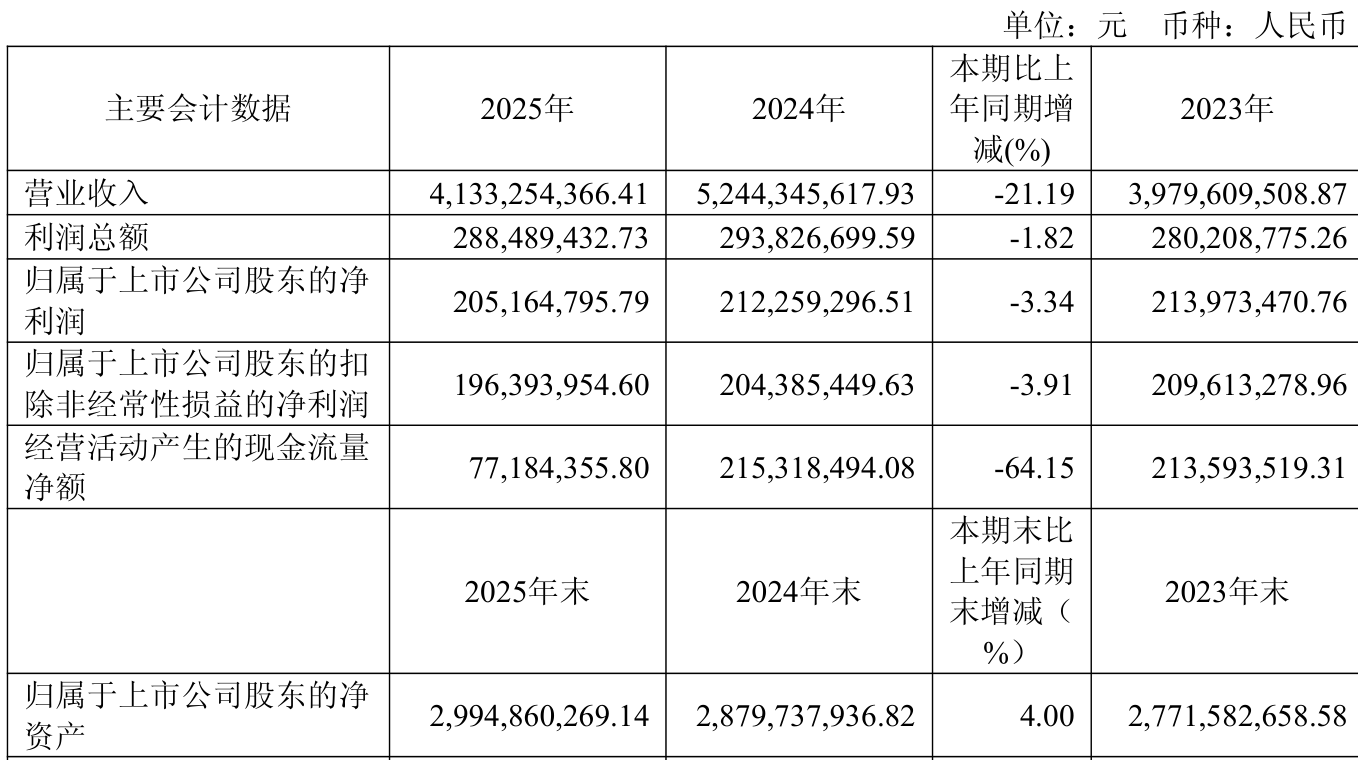 中证智能财讯柏诚股份(601133)4月22日披露2025年年度报告。2025年,公司实现营业总收入41.33亿元,同比下降21.19%;归母净利润2.05亿元,同比下降3.34%;扣非净利润1.96亿元,同比下降3.91%;经营活动产生的现金流量净额为7718.44万元,同比下降64.15%;报告期内,柏诚股份基本每股收益为0.39元,加权平均净资产收益率为6.97%。公司2025年度分配预案为:拟向全体股东每10股派现0.7元(含税)。
