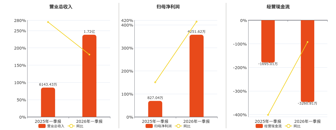 公司营业总收入为1.72亿元。归母净利润为4251.62万元。经营活动现金净流入为-3260.81万元,较去年同报告期经营活动现金净流入减少1565.80万元。
