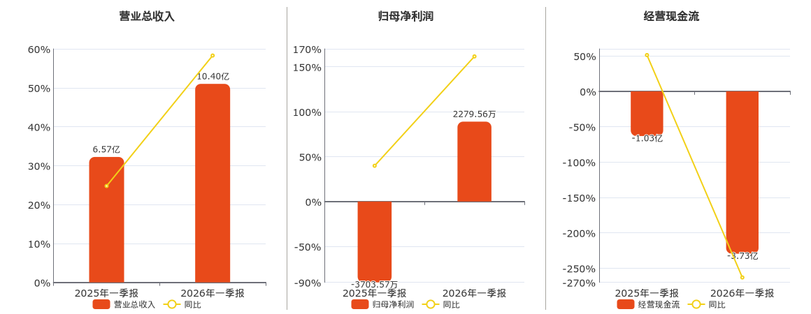 公司营业总收入为10.40亿元。归母净利润为2279.56万元。经营活动现金净流入为-3.73亿元,较去年同报告期经营活动现金净流入减少2.70亿元。