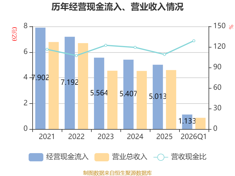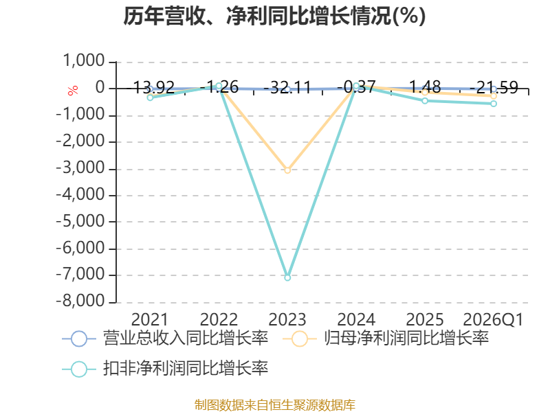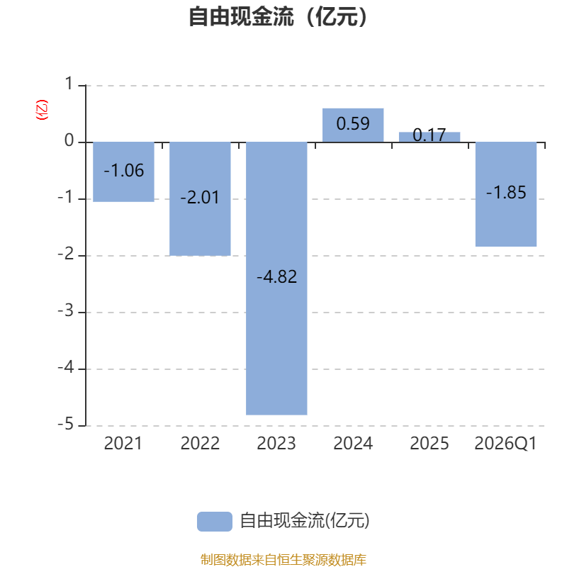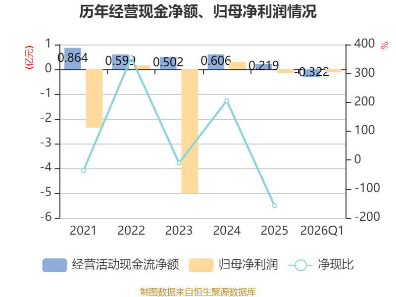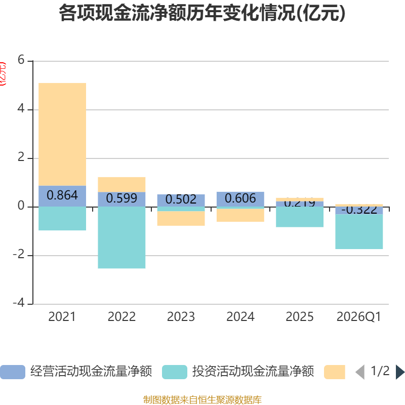 截至2026年一季度末,公司经营活动现金流净额为-3220.73万元,同比减少4193.49万元;筹资活动现金流净额975.41万元,同比减少896.29万元;投资活动现金流净额-1.43亿元,上年同期为-8431.68万元。