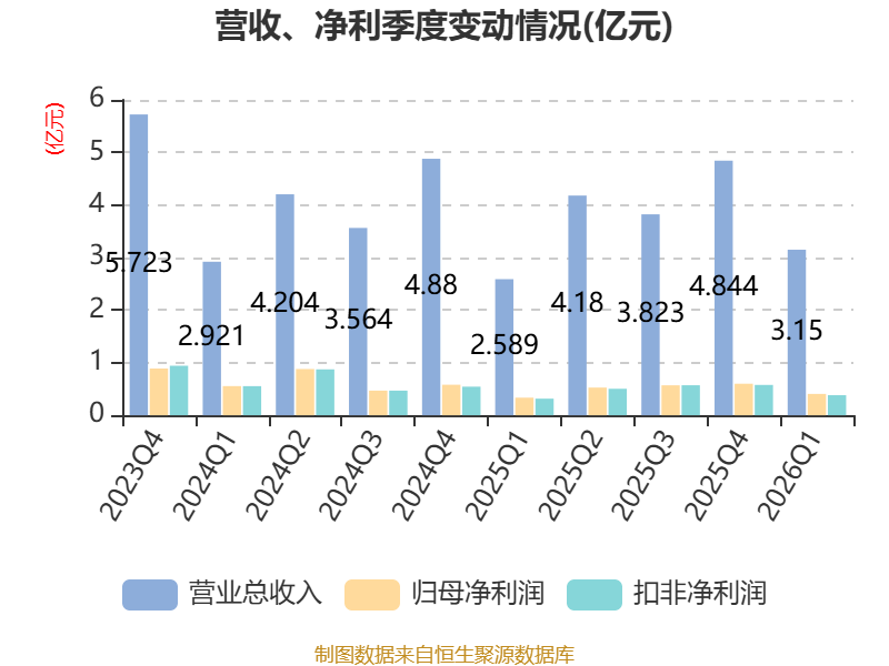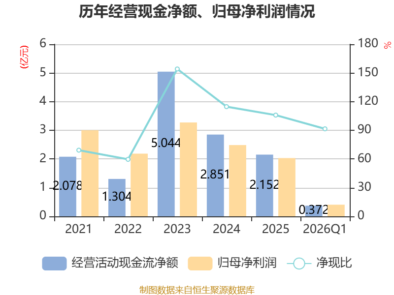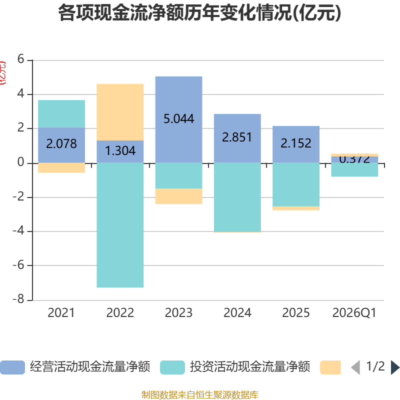截至2026年一季度末,公司经营活动现金流净额为3719.14万元,同比增加1.15亿元;筹资活动现金流净额1662.9万元,同比减少1471.56万元;投资活动现金流净额-8070.38万元,上年同期为-8635.02万元。