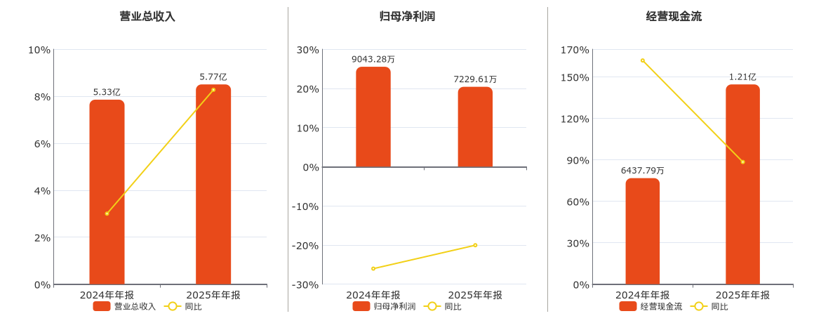 公司营业总收入为5.77亿元。归母净利润为7229.61万元,较去年同报告期归母净利润减少1813.68万元,同比较去年同期下降20.06%。经营活动现金净流入为1.21亿元。