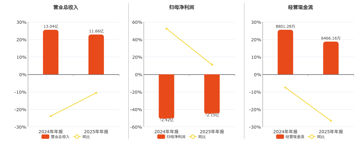 公司营业总收入为11.66亿元,在已披露的同业公司中排名第14,较去年同报告期营业总收入减少1.38亿元,同比较去年同期下降10.58%。归母净利润为-2.15亿元,在已披露的同业公司中排名第12。经营活动现金净流入为6466.16万元,在已披露的同业公司中排名第13,较去年同报告期经营活动现金净流入减少2335.12万元,同比较去年同期下降26.53%。