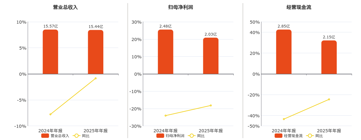 公司营业总收入为15.44亿元,较去年同报告期营业总收入减少1339.22万元,同比较去年同期下降0.86%。归母净利润为2.03亿元,较去年同报告期归母净利润减少4526.26万元,同比较去年同期下降18.22%。经营活动现金净流入为2.15亿元,较去年同报告期经营活动现金净流入减少6988.01万元,同比较去年同期下降24.51%。