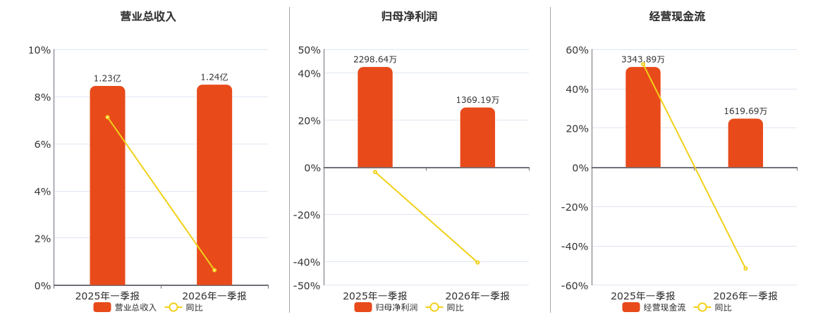 公司营业总收入为1.24亿元。归母净利润为1369.19万元,较去年同报告期归母净利润减少929.45万元,同比较去年同期下降40.43%。经营活动现金净流入为1619.69万元,较去年同报告期经营活动现金净流入减少1724.20万元,同比较去年同期下降51.56%。