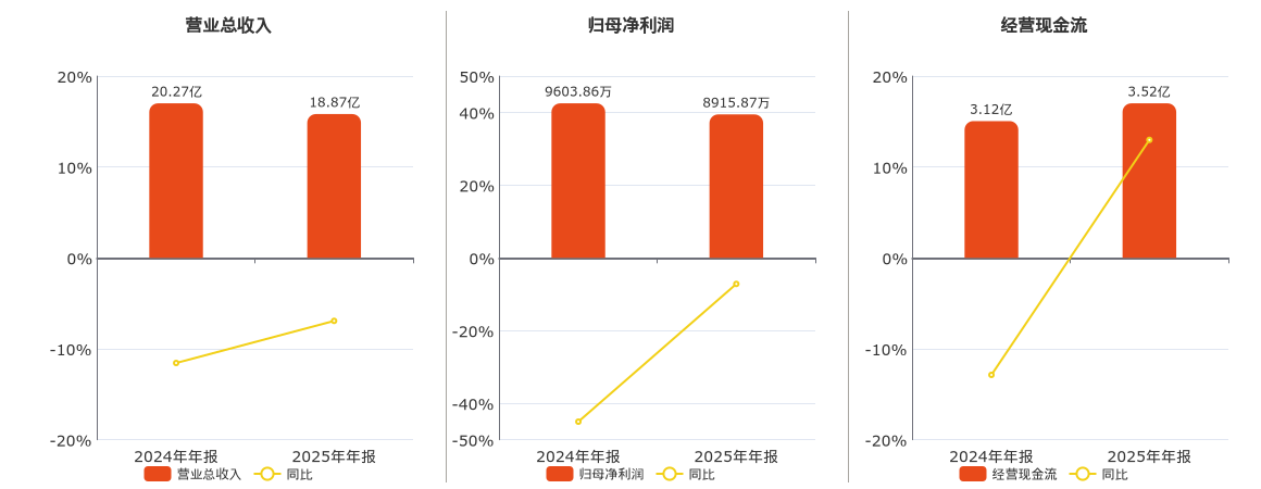 公司营业总收入为18.87亿元,在已披露的同业公司中排名第50,较去年同报告期营业总收入减少1.41亿元,同比较去年同期下降6.93%。归母净利润为8915.87万元,在已披露的同业公司中排名第45,较去年同报告期归母净利润减少687.99万元,同比较去年同期下降7.16%。经营活动现金净流入为3.52亿元。