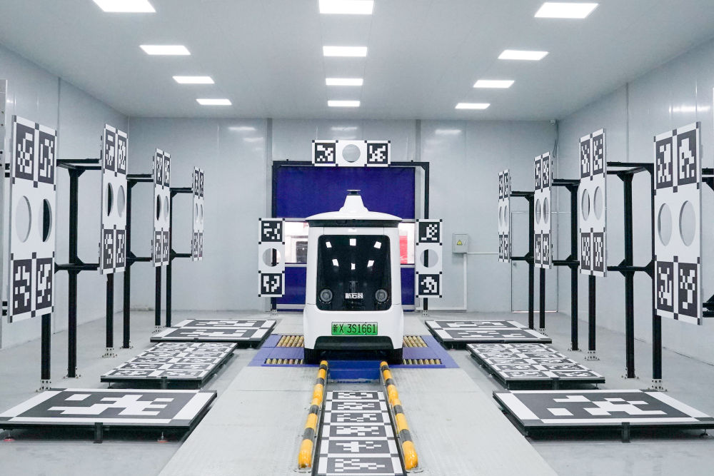 在新石器(盐城)智能制造有限公司无人车生产线,一辆无人车在进行调试(2026年3月25日摄)。新华社记者李博摄