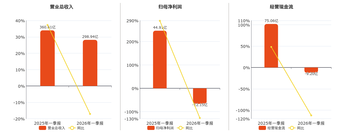 公司营业总收入为298.94亿元,较去年同报告期营业总收入减少61.68亿元,同比较去年同期下降17.10%。归母净利润为-12.15亿元,较去年同报告期归母净利润减少57.06亿元,同比较去年同期下降127.05%。经营活动现金净流入为-9.20亿元,较去年同报告期经营活动现金净流入减少84.26亿元,同比较去年同期下降112.26%。