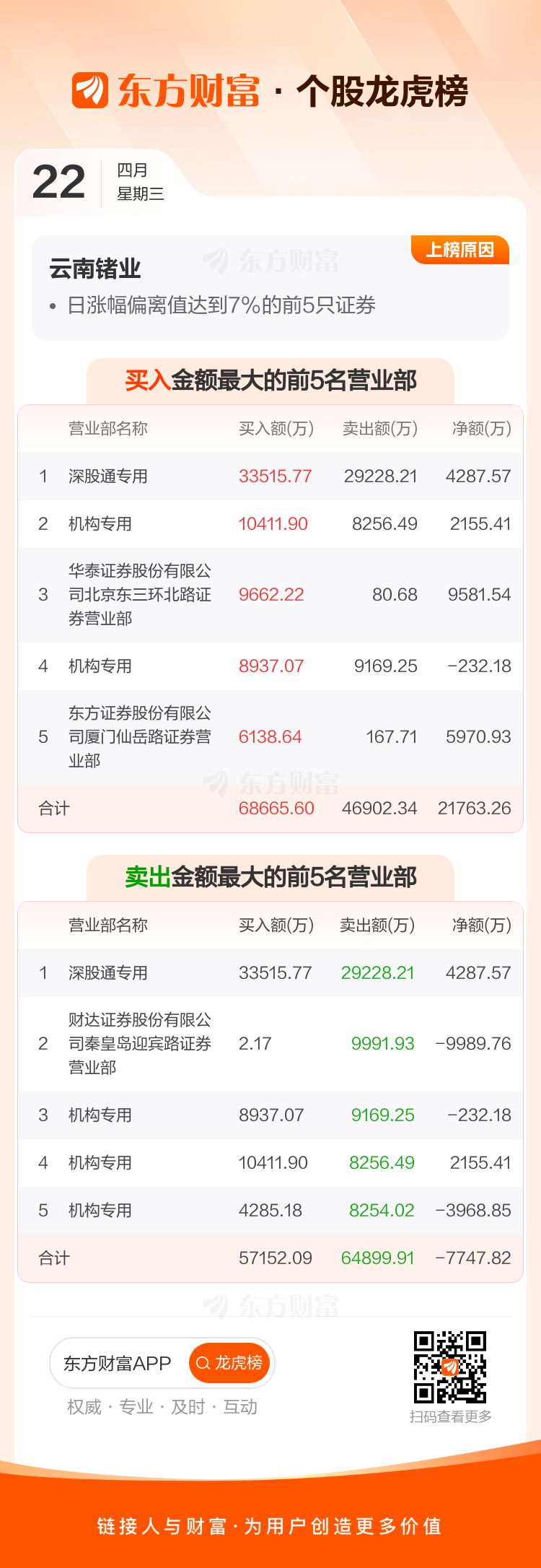 交易所2026年4月22日公布的交易公开信息显示,云南锗业因成为日涨幅偏离值达到7%的前5只证券上榜。云南锗业当日收报75.24元,涨跌幅10.00%,偏离值9.00%,换手率10.94%,成交额52.58亿。