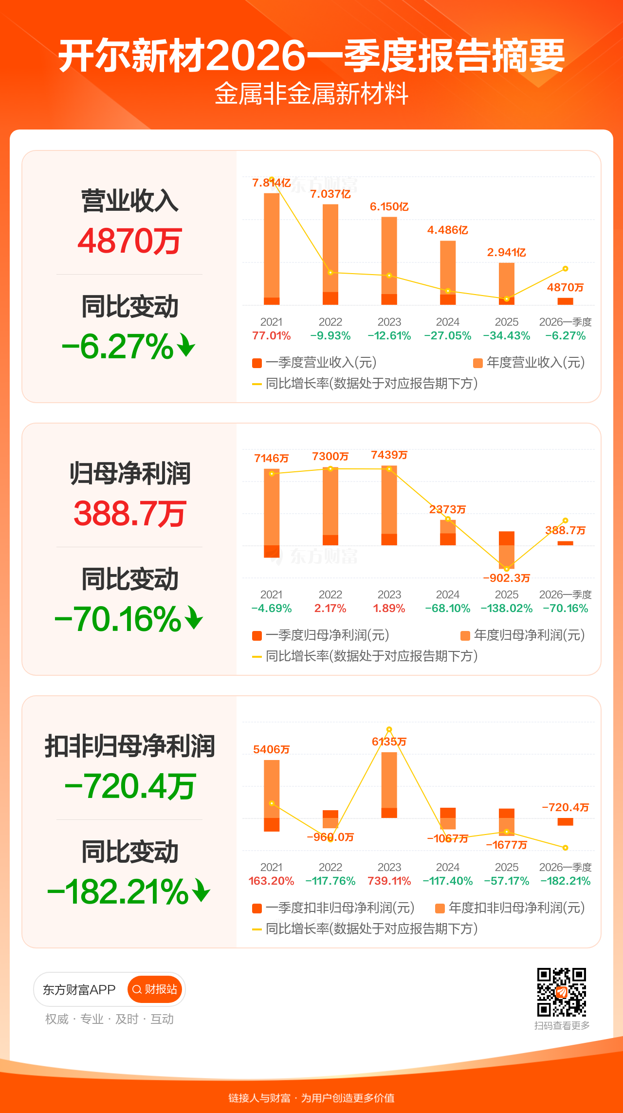 开尔新材4月23日发布2026年一季报显示,公司一季度实现营业收入4869.55万元,同比下滑6.27%;归母净利润388.66万元,同比下滑70.16%;扣非归母净利润-720.44万元。