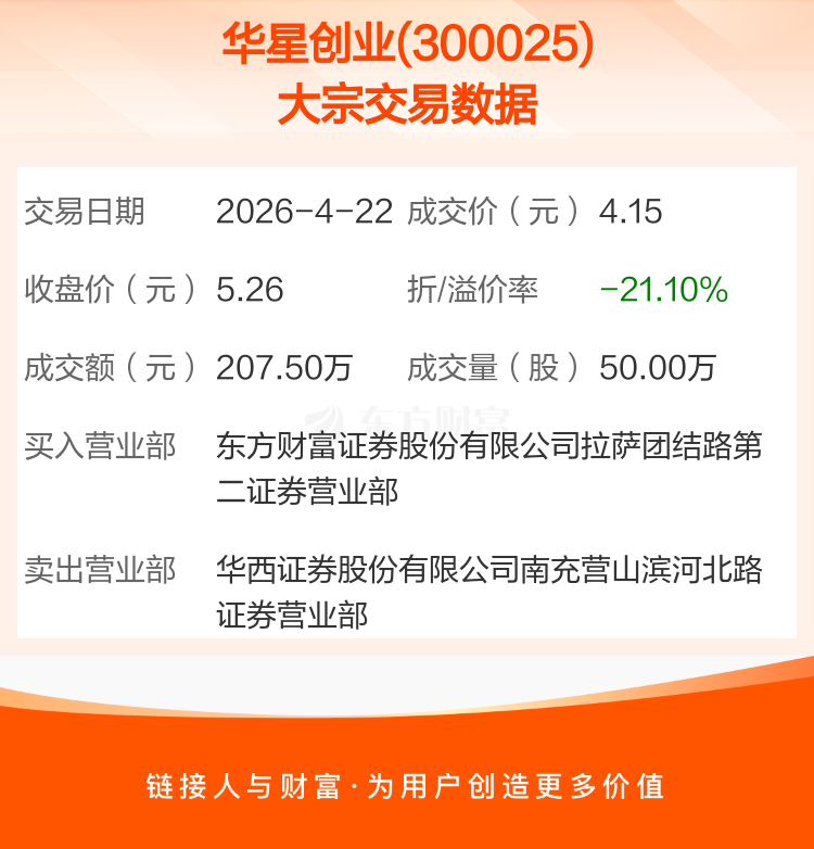 2026年4月22日,华星创业发生1笔大宗交易,共成交50.00万股,成交金额207.50万元,占其流通市值比例为0.08%。