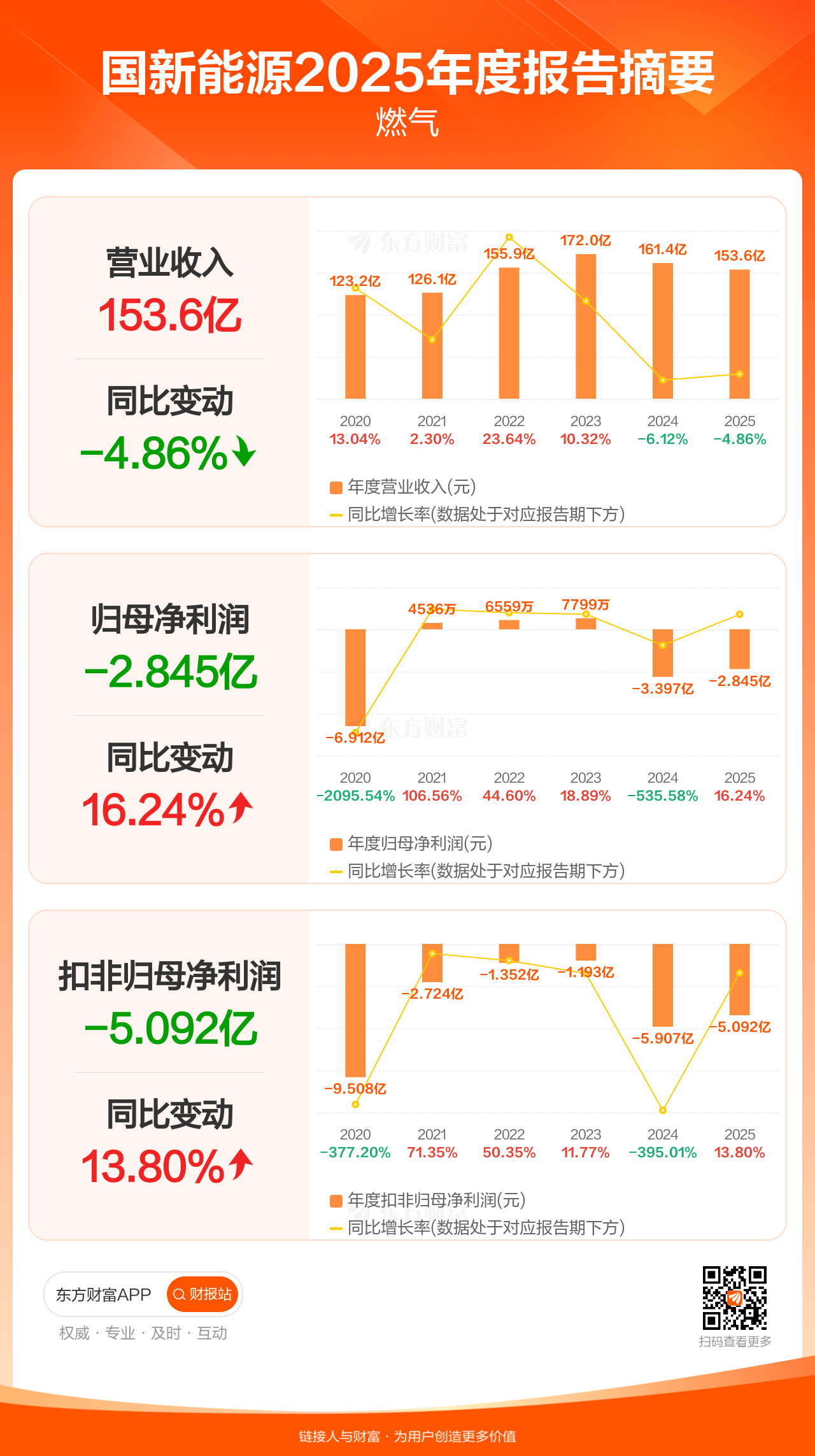 国新能源4月23日发布2025年年报显示,公司全年实现营业收入153.61亿元,同比下滑4.86%;归母净利润-2.85亿元;扣非归母净利润-5.09亿元。