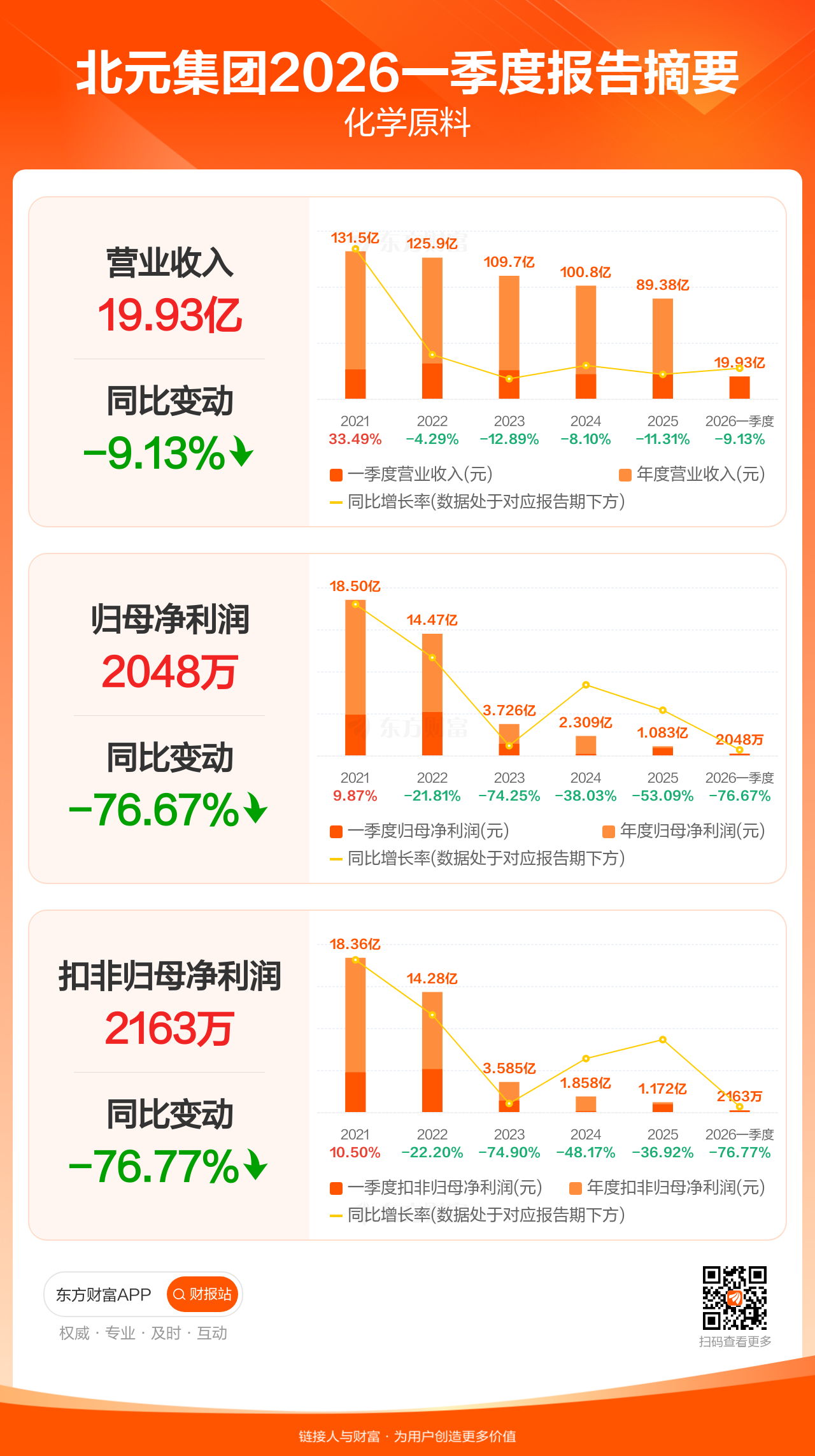 北元集团4月23日发布2026年一季报显示,公司一季度实现营业收入19.93亿元,同比下滑9.13%;归母净利润2048.46万元,同比下滑76.67%;扣非归母净利润2162.97万元,同比下滑76.77%。