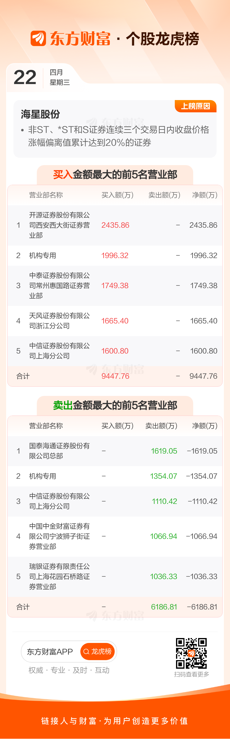 交易所2026年4月22日公布的交易公开信息显示,海星股份因成为非ST、*ST和S证券连续三个交易日内收盘价格涨幅偏离值累计达到20%的证券上榜。海星股份当日收报53.56元,涨跌幅10.00%,换手率1.40%,成交额1.80亿。异常期间4月21日至4月22日,期间涨幅21.01%,累计偏离值20.42%,区间成交额5.78亿。