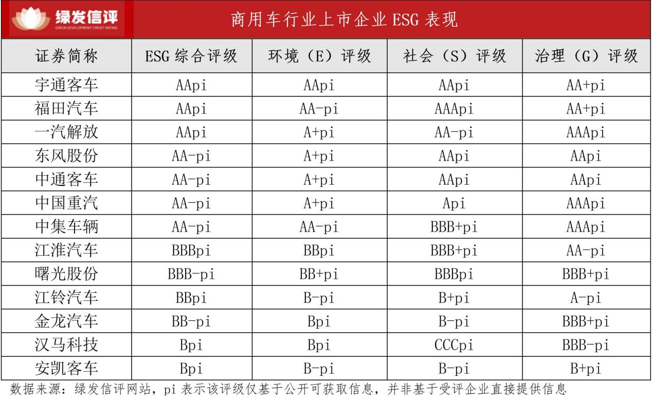 中国财富网讯作为公路物流运输、公共出行服务的核心装备支撑,商用车行业是我国交通运输体系的基石产业,更是实现交通领域“双碳”减排、物流网络绿色升级的关键赛道。随着国内新能源商用车转型浪潮席卷、物流行业可持续发展要求持续提升,企业的ESG治理能力已成为衡量行业企业长期竞争力的核心维度。近日,海南绿色发展信用评级有限公司(以下简称“绿发信评”)发布A股上市公司ESG主动评级结果,国内头部商用车企业已率先完成新能源转型与ESG体系深度融合,行业整体转型势能充足,但企业间发展差距明显,全产业链可持续建设仍有广阔升级空间。