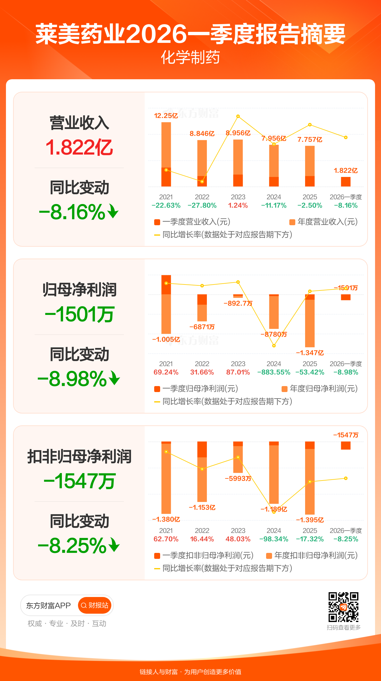 莱美药业4月23日发布2026年一季报显示,公司一季度实现营业收入1.82亿元,同比下滑8.16%;归母净利润-1501.27万元;扣非归母净利润-1547.03万元。