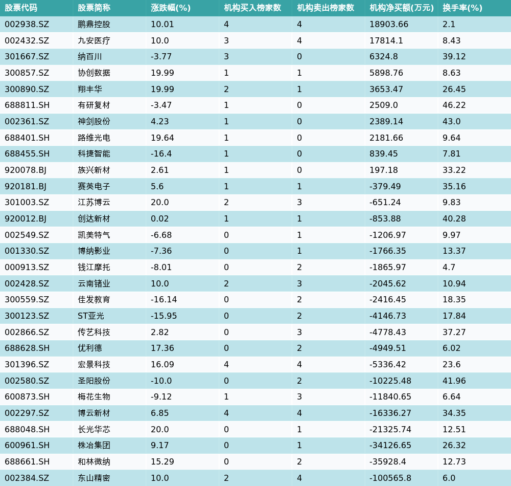 南财智讯4月22日电,盘后数据显示,因当日异动登上龙虎榜的个股中,29只沪深A股龙虎榜出现了机构的身影,机构合计净卖出200034.83万元,具体来看,机构净买入10只个股,净卖出19只个股。其中,机构净买入前三分别为鹏鼎控股(002938.SZ)、九安医疗(002432.SZ)与纳百川(301667.SZ),详情见下图:机构净卖出的个股中,前三分别为东山精密(002384.SZ)、和林微纳(688661.SH)与株冶集团(600961.SH)。