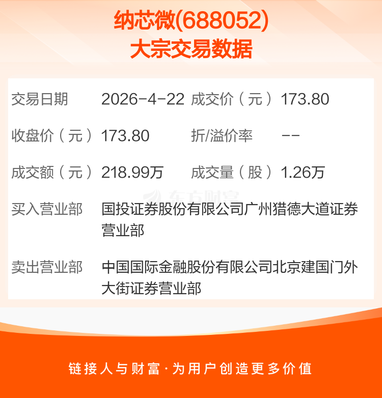 2026年4月22日,纳芯微发生1笔大宗交易,共成交1.26万股,成交金额218.99万元。