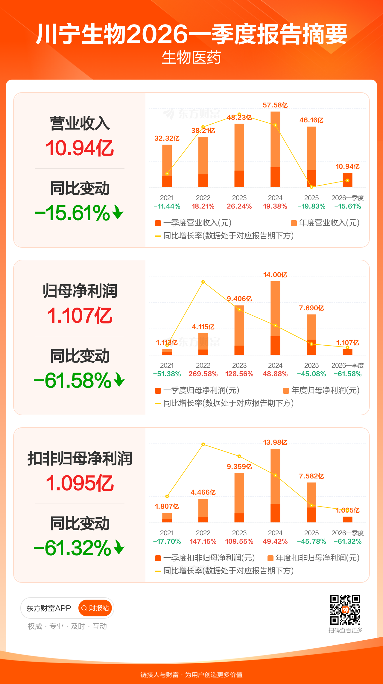 川宁生物4月23日发布2026年一季报显示,公司一季度实现营业收入10.94亿元,同比下滑15.61%;归母净利润1.11亿元,同比下滑61.58%;扣非归母净利润1.09亿元,同比下滑61.32%。