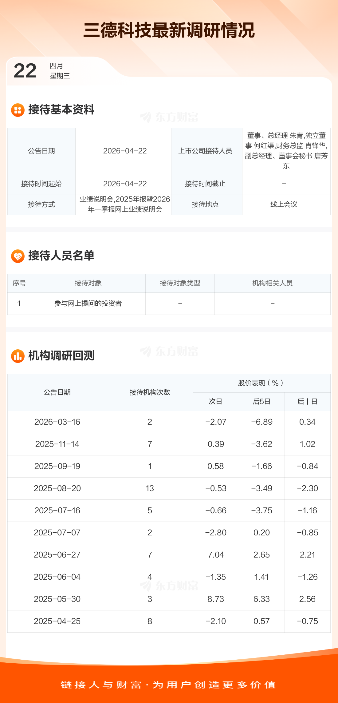 三德科技4月22日公告称,4月22日接待参与网上提问的投资者调研。接待人员包括董事、总经理 朱青,独立董事 何红渠,财务总监 肖锋华,副总经理、董事会秘书 唐芳东。