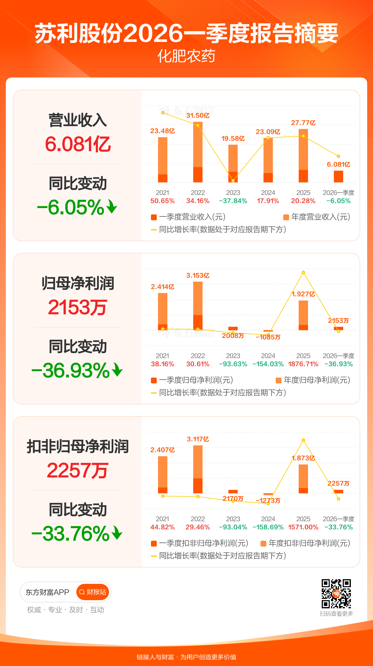 苏利股份4月23日发布2026年一季报显示,公司一季度实现营业收入6.08亿元,同比下滑6.05%;归母净利润2152.79万元,同比下滑36.93%;扣非归母净利润2257.30万元,同比下滑33.76%。
