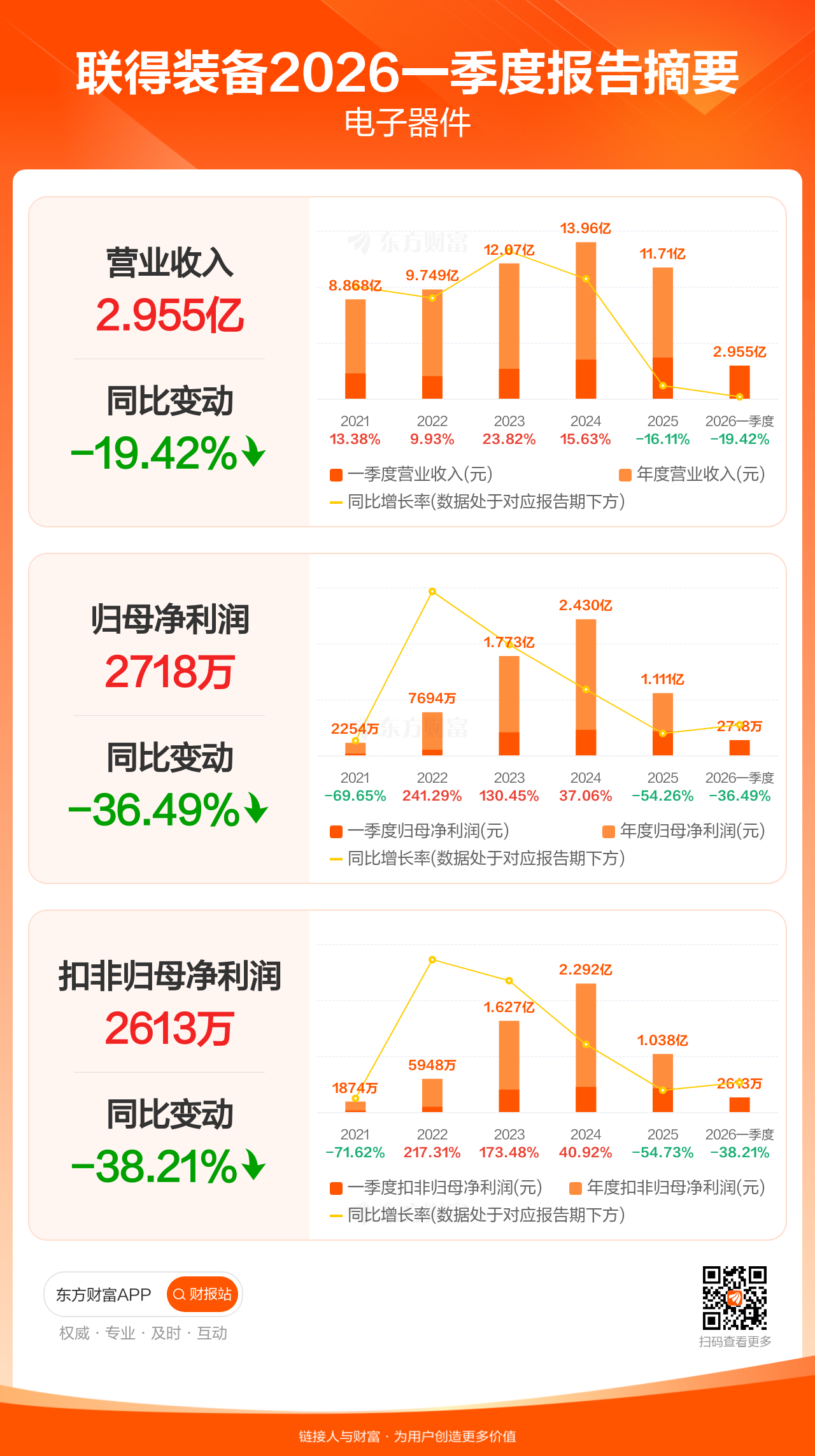 联得装备4月23日发布2026年一季报显示,公司一季度实现营业收入2.95亿元,同比下滑19.42%;归母净利润2717.98万元,同比下滑36.49%;扣非归母净利润2612.78万元,同比下滑38.21%。