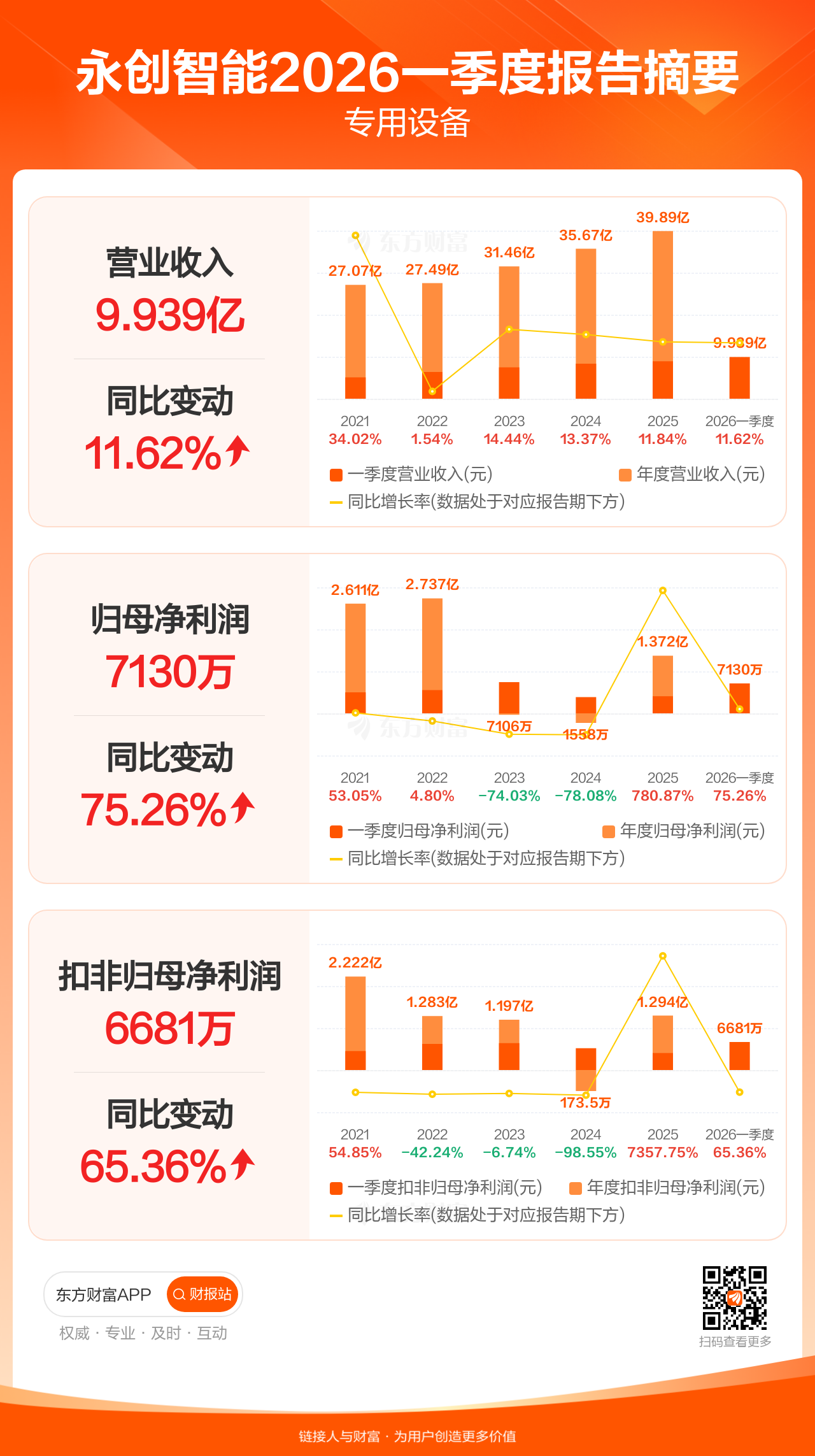 永创智能4月23日发布2026年一季报显示,公司一季度实现营业收入9.94亿元,同比增长11.62%;归母净利润7129.56万元,同比增长75.26%;扣非归母净利润6681.43万元,同比增长65.36%。