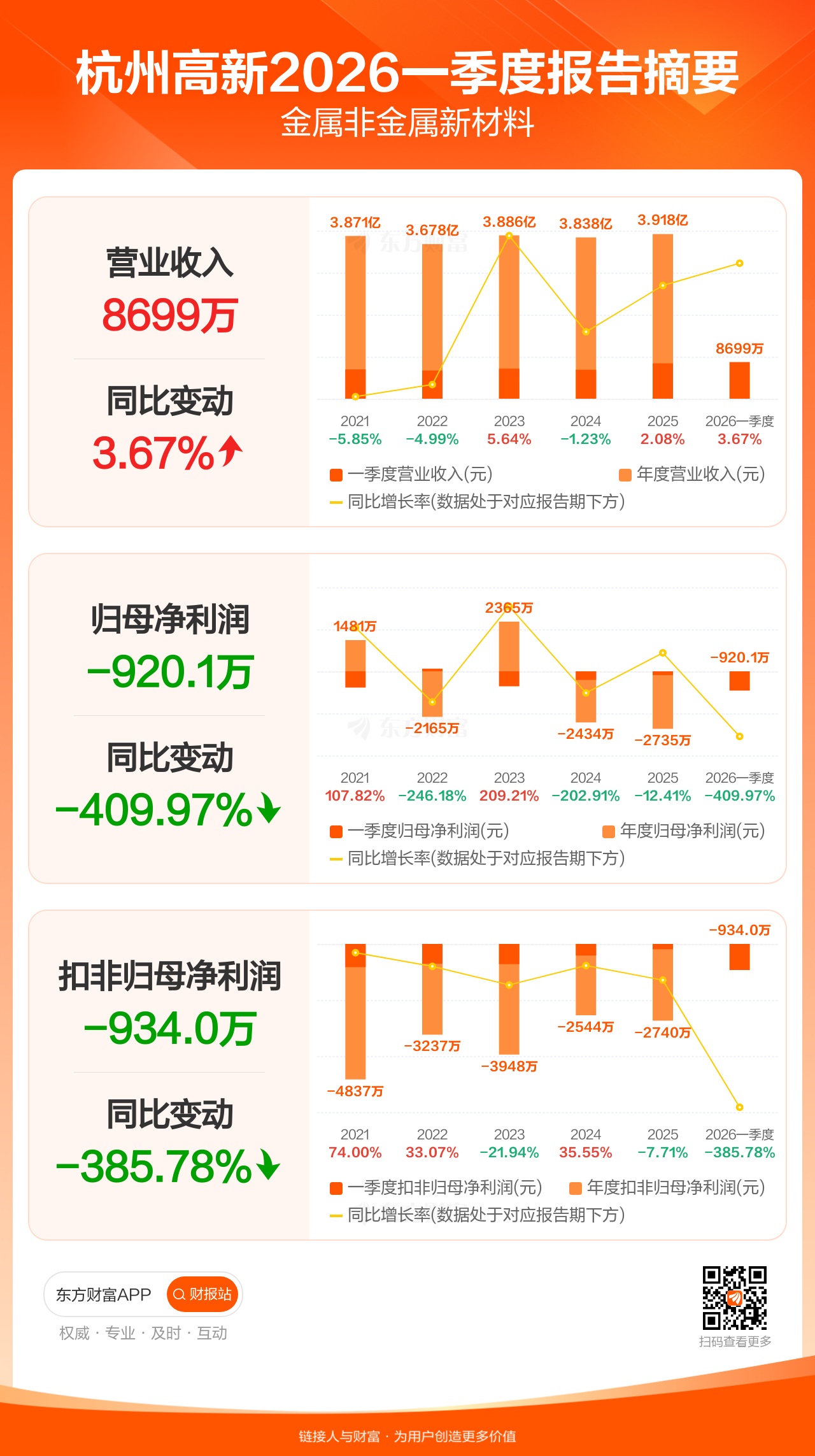 杭州高新4月23日发布2026年一季报显示,公司一季度实现营业收入8698.73万元,同比增长3.67%;归母净利润-920.15万元;扣非归母净利润-933.97万元。