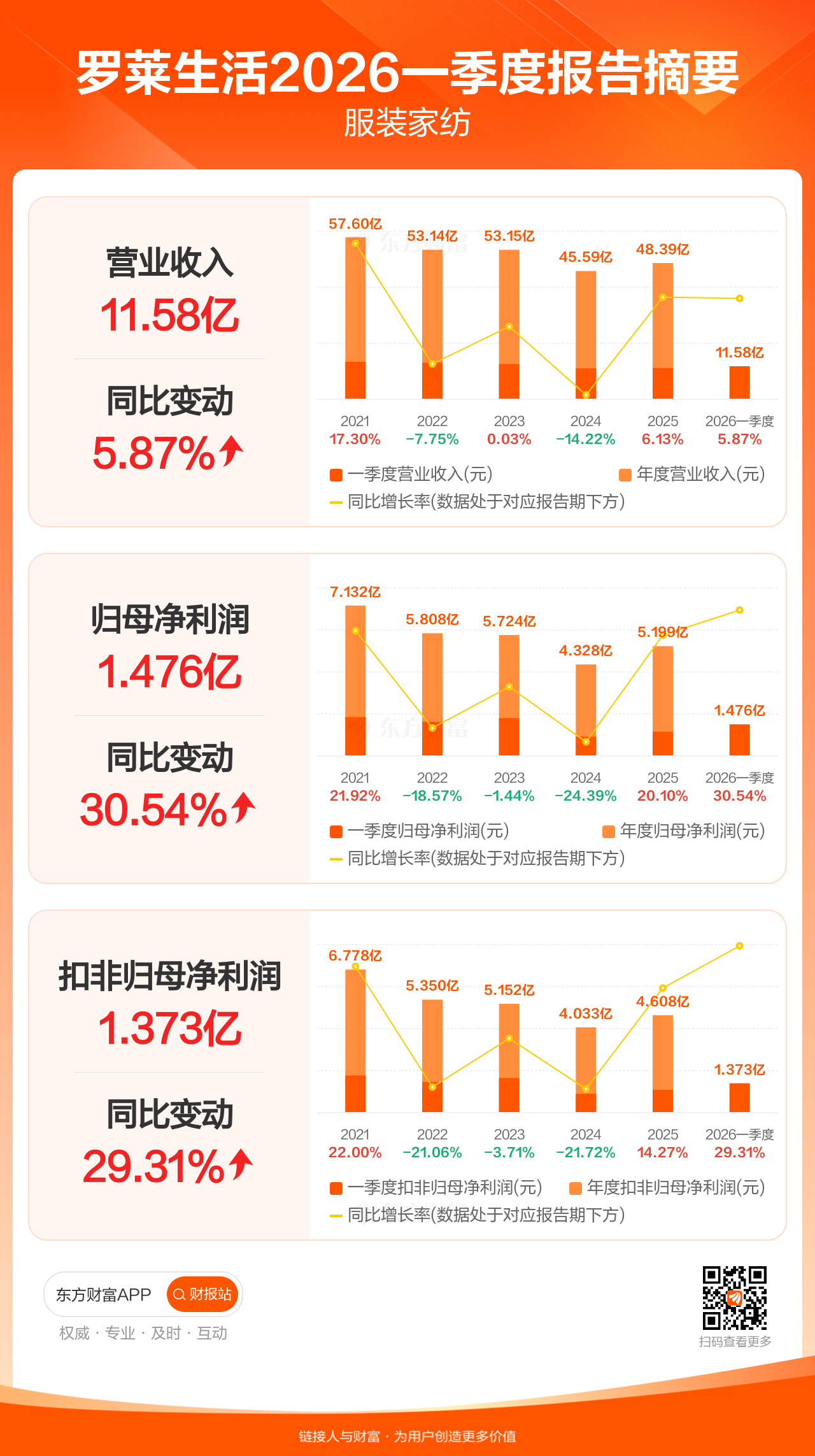 罗莱生活4月23日发布2026年一季报显示,公司一季度实现营业收入11.58亿元,同比增长5.87%;归母净利润1.48亿元,同比增长30.54%;扣非归母净利润1.37亿元,同比增长29.31%。