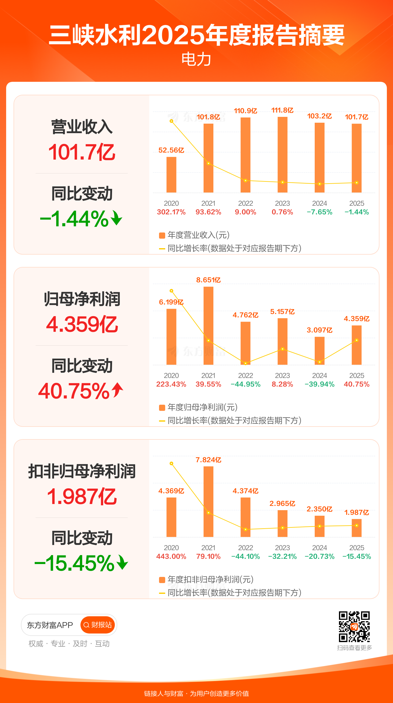 三峡水利4月23日发布2025年年报显示,公司全年实现营业收入101.73亿元,同比下滑1.44%;归母净利润4.36亿元,同比增长40.75%;扣非归母净利润1.99亿元,同比下滑15.45%。