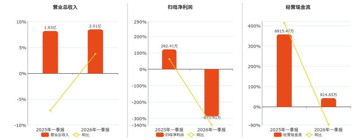 公司营业总收入为2.01亿元。归母净利润为-675.41万元,较去年同报告期归母净利润减少957.82万元,同比较去年同期下降339.16%。经营活动现金净流入为814.65万元,较去年同报告期经营活动现金净流入减少6000.82万元,同比较去年同期下降88.05%。