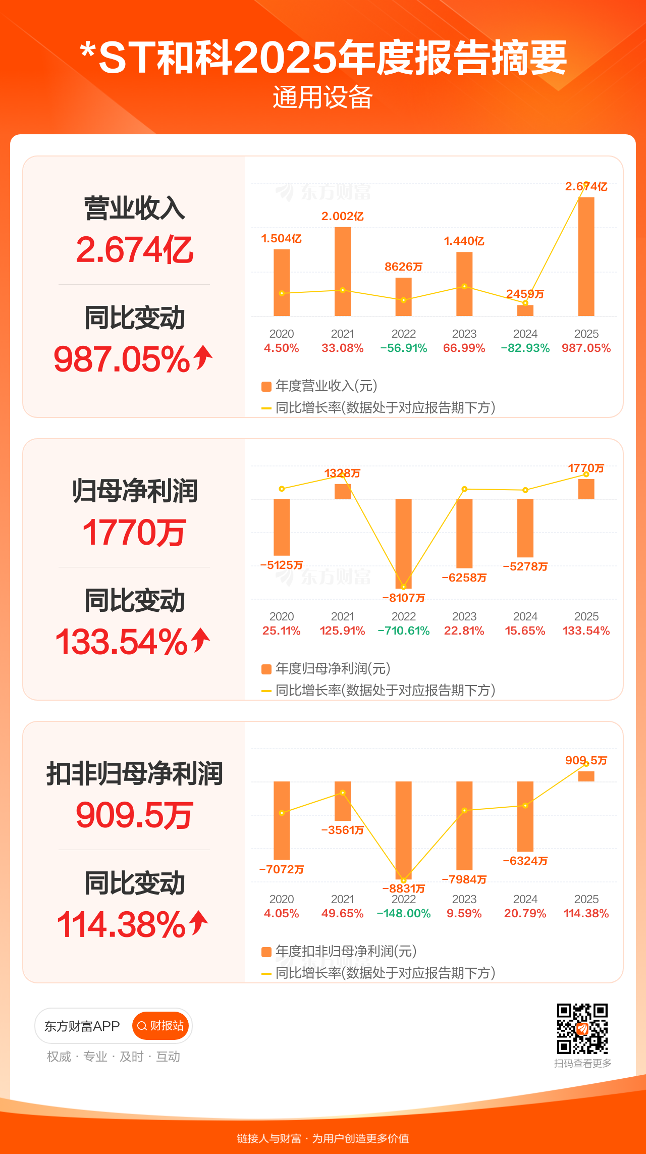 *ST和科4月23日发布2025年年报显示,公司全年实现营业收入2.67亿元,同比增长987.05%;归母净利润1770.19万元,同比增长133.54%;扣非归母净利润909.49万元,同比增长114.38%。