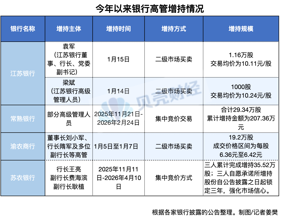 近期,苏农银行披露,该行行长王亮、副行长费海滨、耿植三人自2025年11月11日至2026年4月10日,累计完成增持35.52万股,占总股本0.0176%,累计金额183.20万元。同时,三人自愿承诺所增持股份自公告披露之日起锁定三年,强化市场信心。
